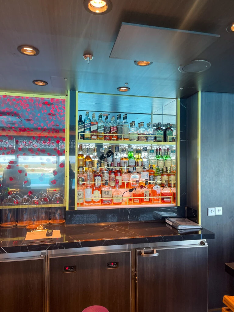 Our mixology class was held at The Rose Bar on the Disney Wish, and let me just say—it’s an absolutely stunning spot. The words “hidden gem” are over used, but this really is the way to describe this Deck 12 Bar on Disney Wish and Disney Treasure.
