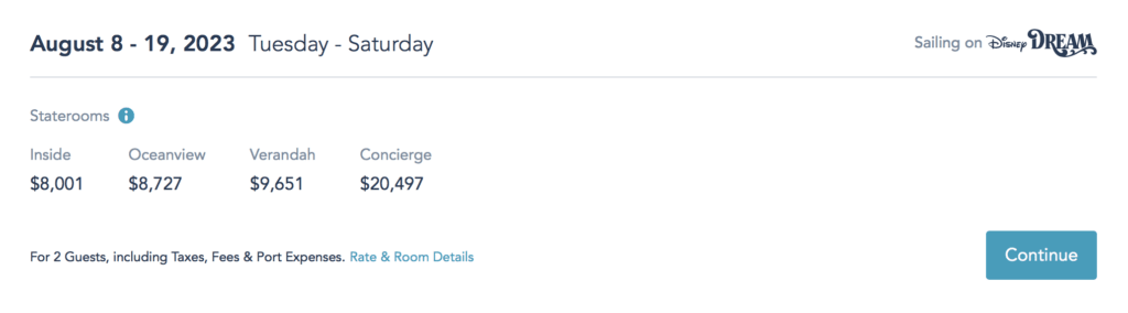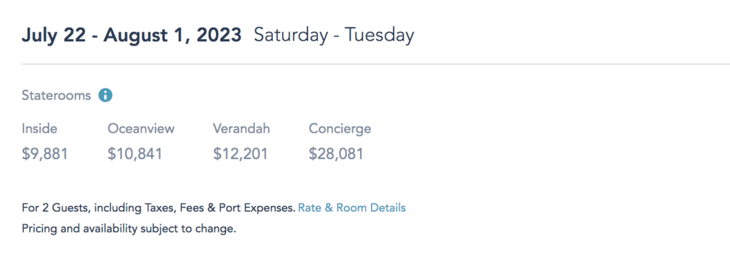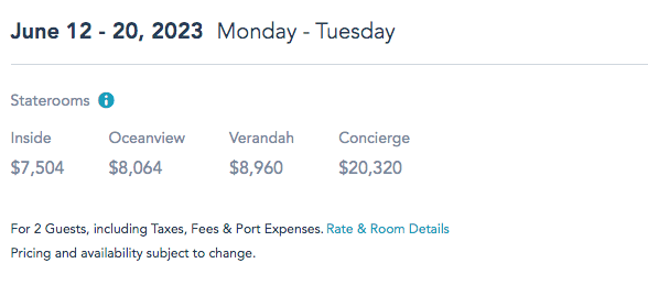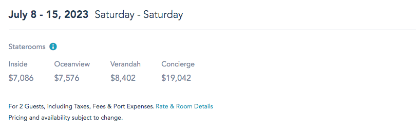 The one exception is for Concierge Staterooms. The already high starting cost is now a whopping $52,029 if you want to sail Concierge. This is for a One Bedroom Suite.