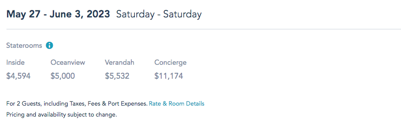 Here is the pricing which was available on May 11, 2022. There isn’t much change in the Oceanview or Verandah, but a slight increase for an Inside stateroom.