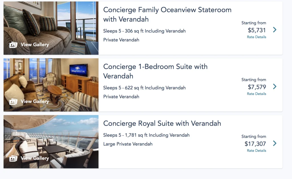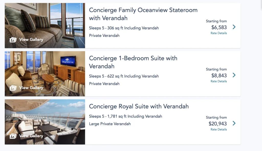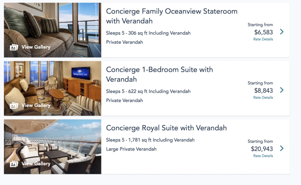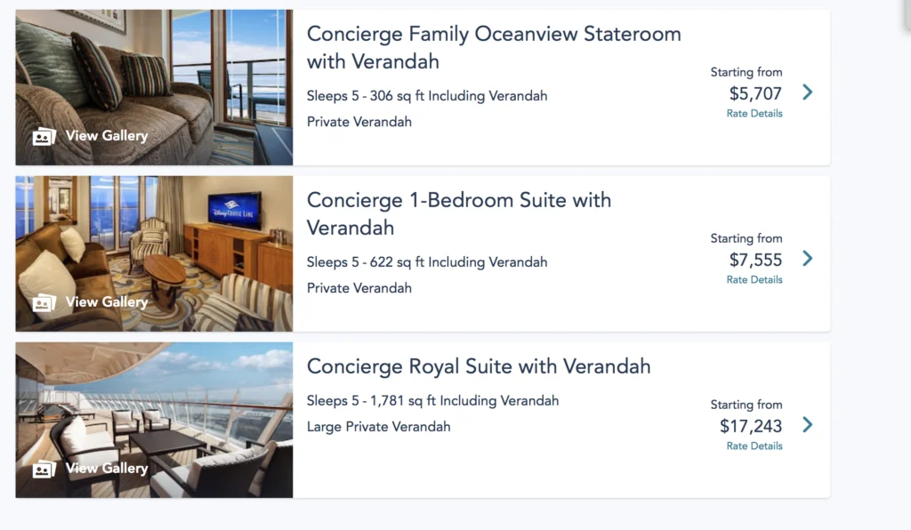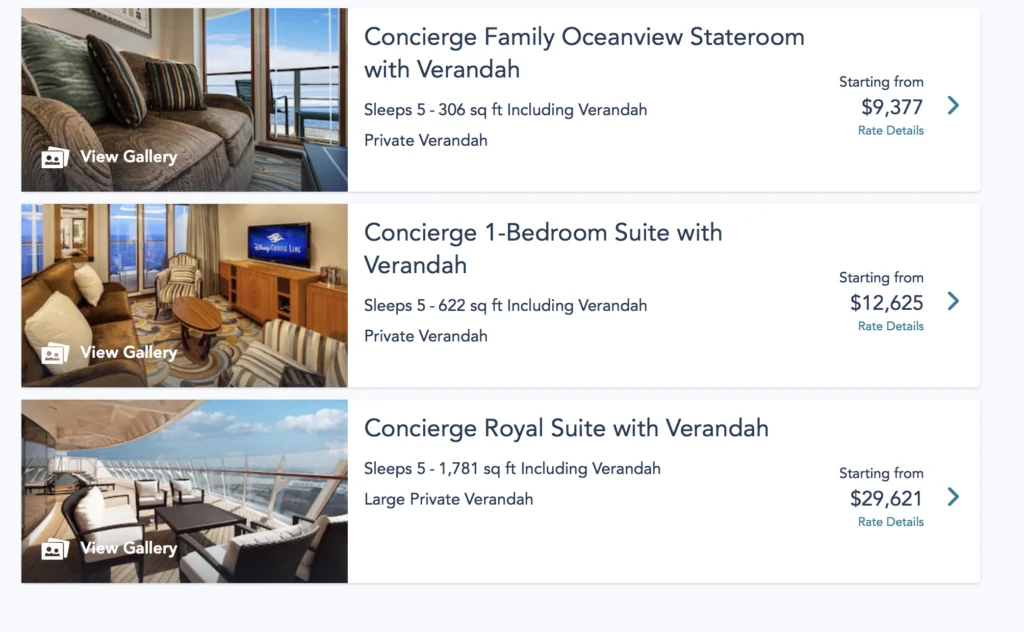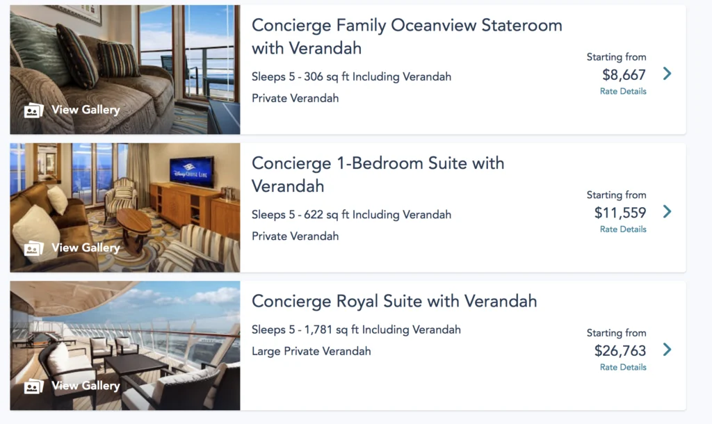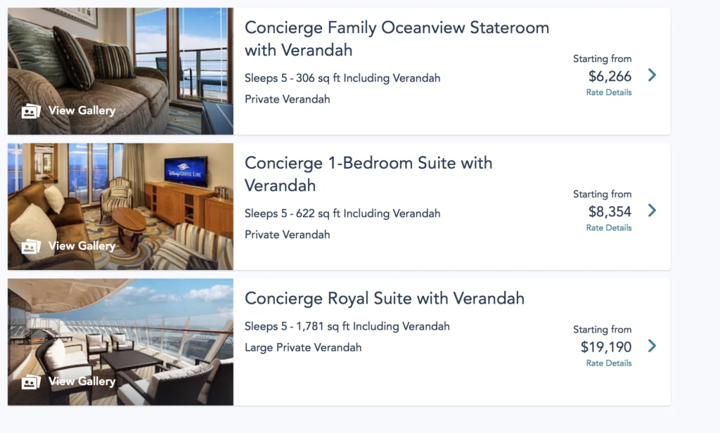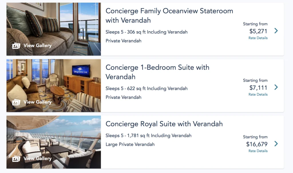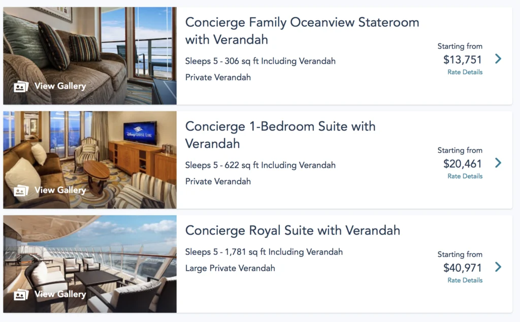 Note that prices will vary a lot and that Concierge Staterooms on Disney ships are highly sought after. Most concierge staterooms sell out soon after they are released, particularly the suites. The Walt and Roy Disney suites usually sell out within a few days of being released.