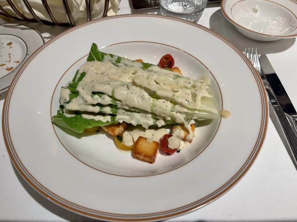 - Split Napa Baby Romaine Lettuce Caesar Dressing, Heirloom Grape Tomatoes, Parmigiano-Reggiano, Ciabatta Garlic Croutons