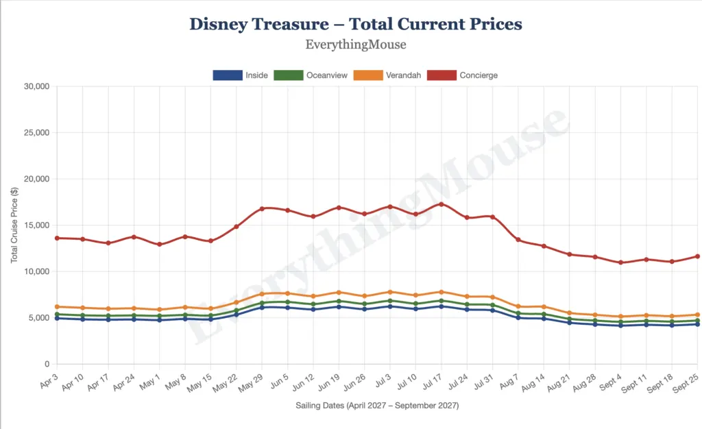 Disney Cruise Line has now released the Disney Treasure sailings for May through September 2027, and in this article you’ll find the opening day prices for those newly announced dates.