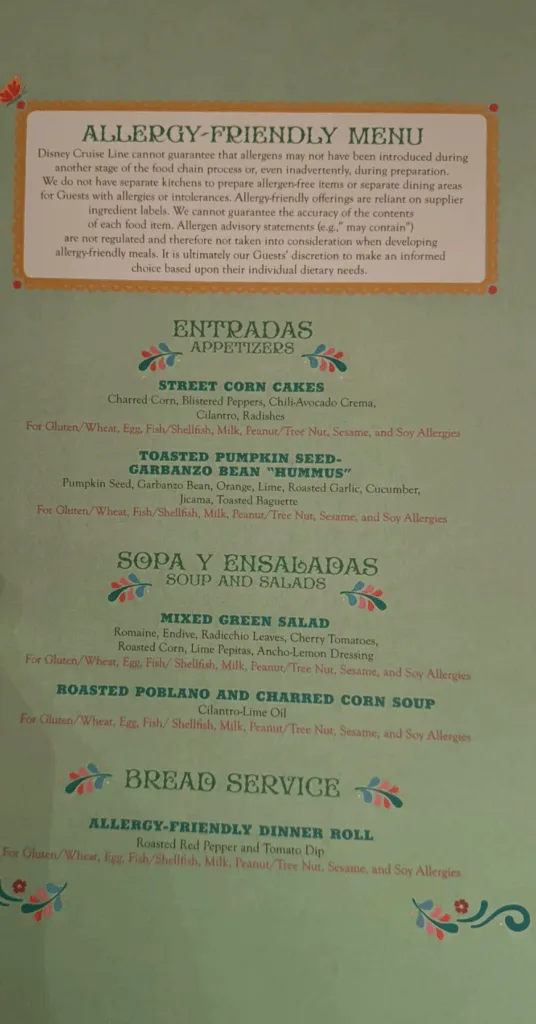 Disney Treasure Coco de Plaza Allergy Friendly Menu