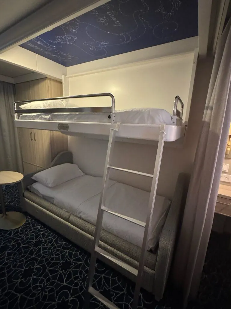 If you look closely at the ceiling of this stateroom you can see that there is a pull down bed in the ceiling.