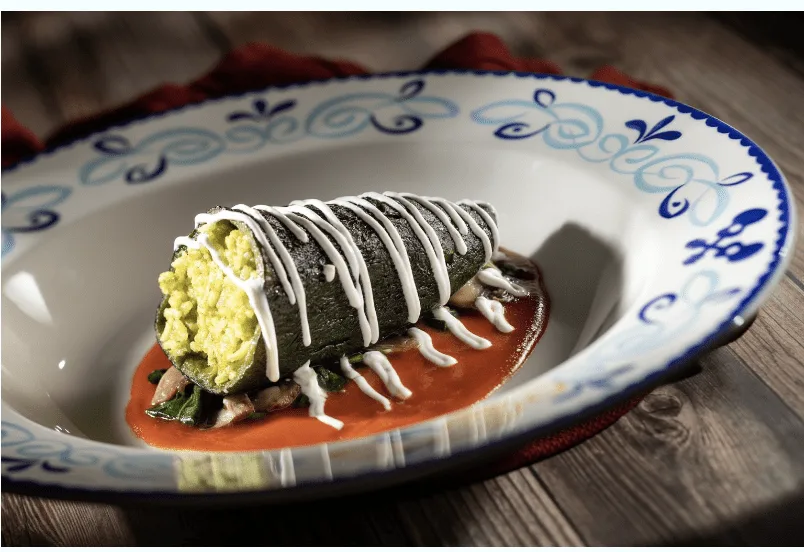 Blistered Poblano Pepper stuffed with Oaxaca cheese and green rice