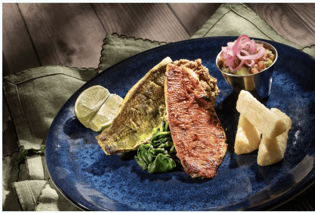- Red Capsicum and Green Parsley Grilled Snapper with fried yucca, refried beans, baby spinach, and pico de gallo