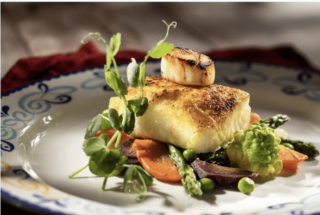 - Pan-Seared Adobo Spiced Sea Bass with seared scallops, rainbow carrots, spinach, Romanesco, peas, and chimichurri sauce