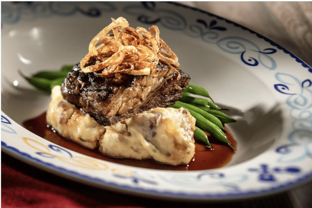 - Enrique’s Port Wine Braised Center Cut Beef Short Rib with cheddar cheese and green onion red mash and long green beans with crisp shallots
