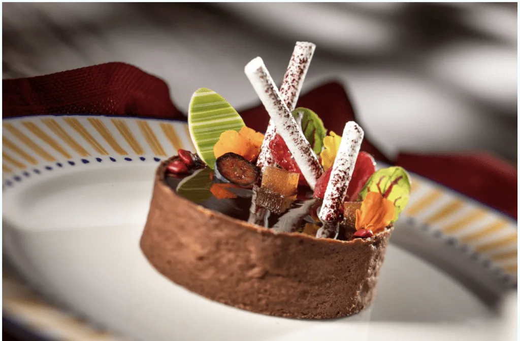 Mexican Chocolate Tart with spiced chocolate crème, caramel pecan nuts, and chocolate glaze
