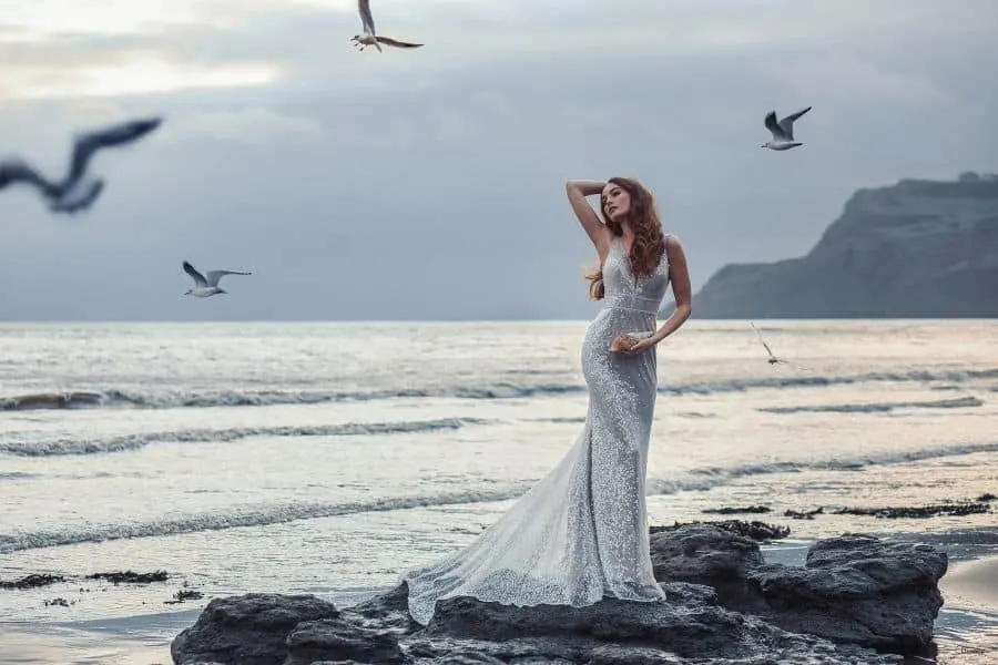 This is a classic mermaid dress shape. It is decorated with ocean inspired pearls, crystals, sequins and glass beads. This gives a wonderful shimmering effect and sequins that sparkle just like Ariel.