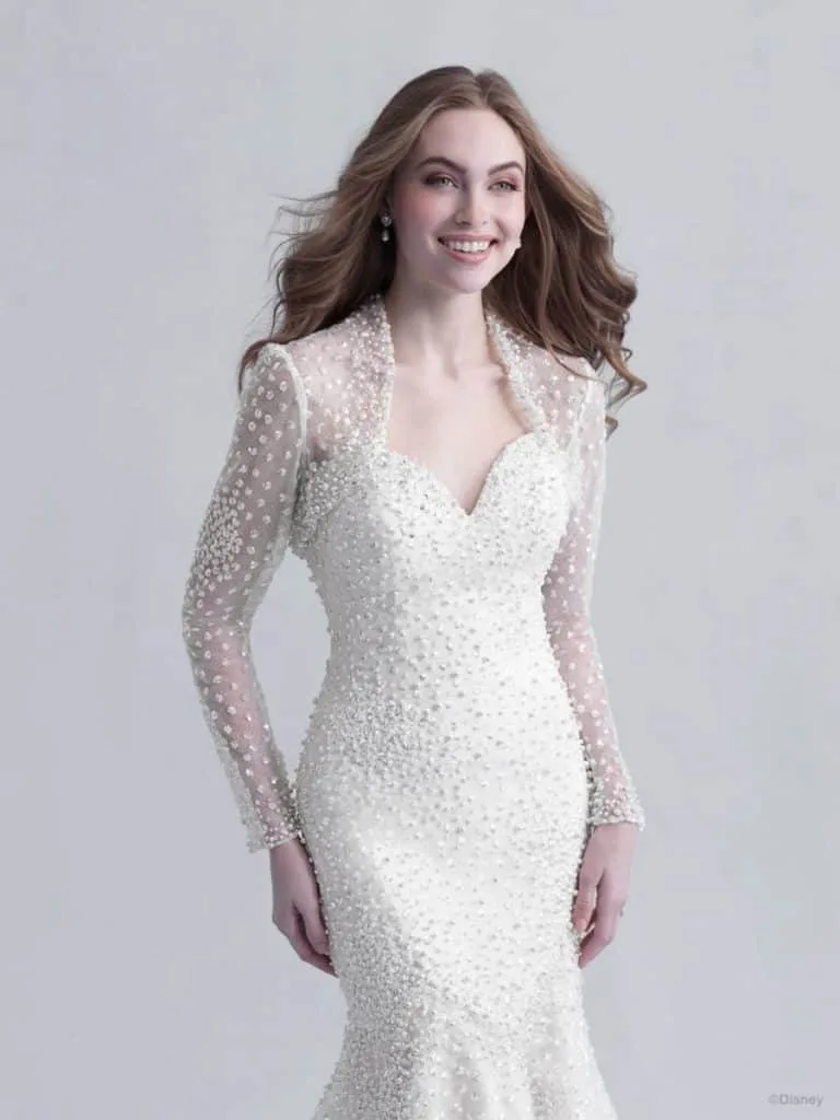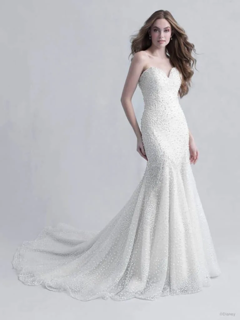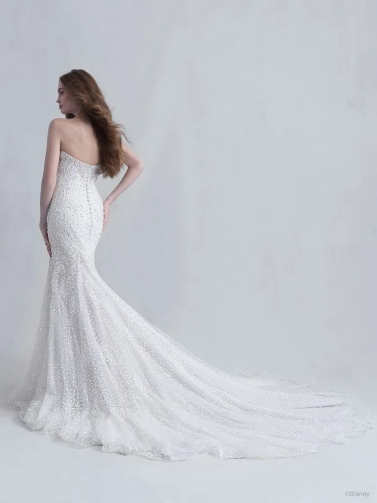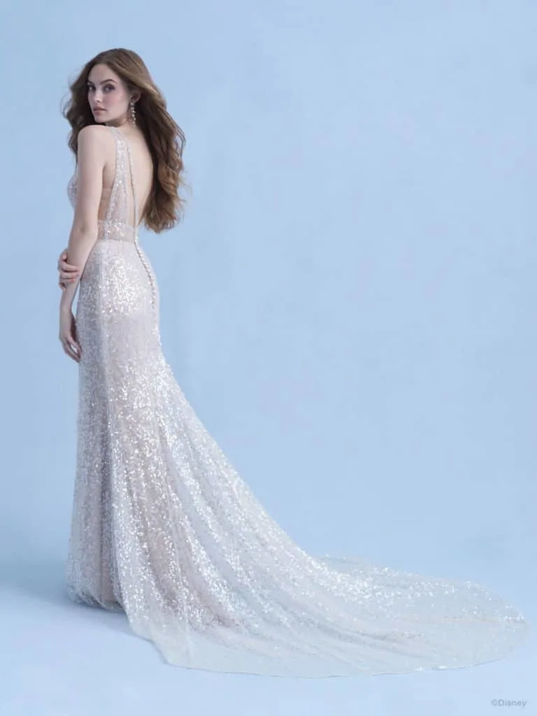 This Disney Ariel Wedding Dress is from the Allure Bridal Collection. It is a twist on the usual “mermaid” shape, but definitely evokes the image of Ariel and her connection to the ocean. The distinctive shimmering look catches the light beautifully.