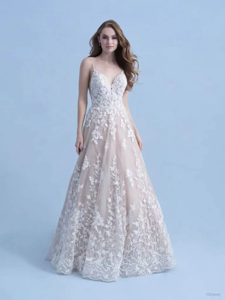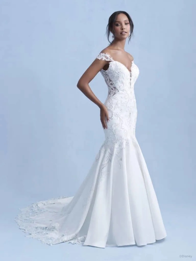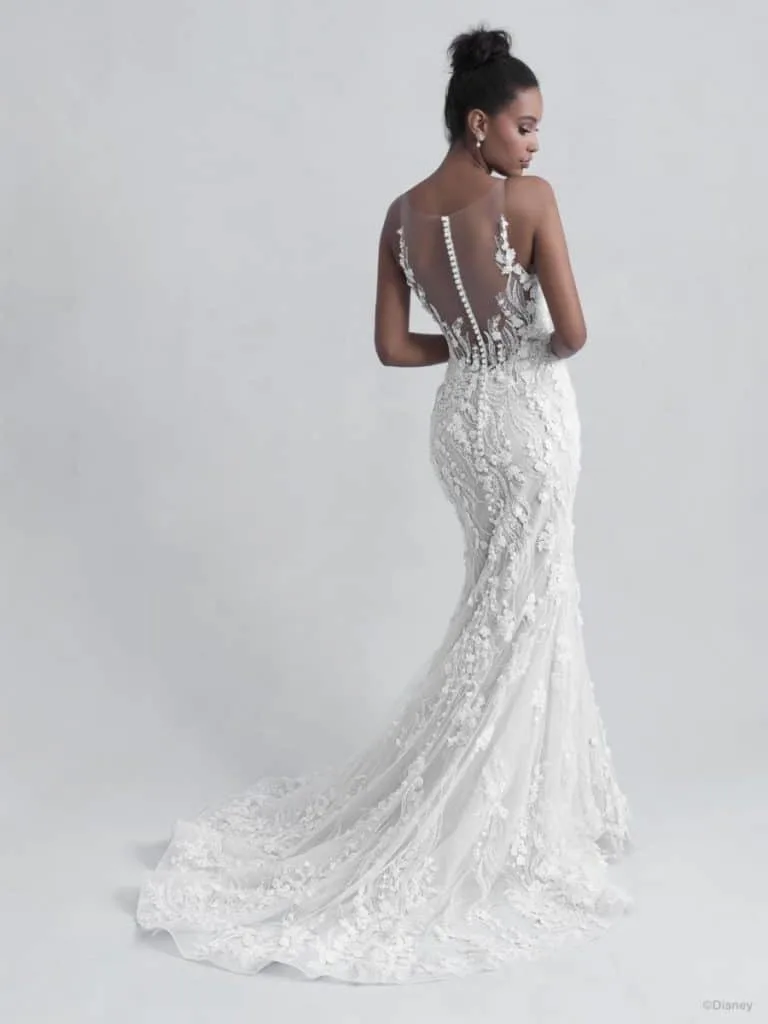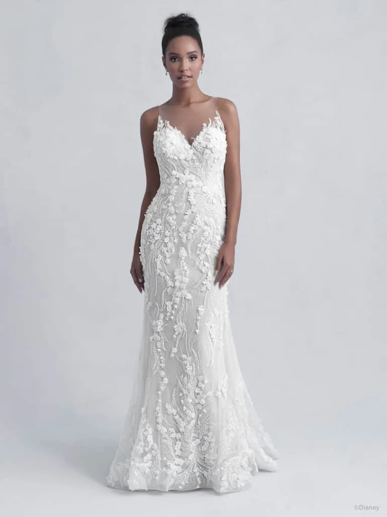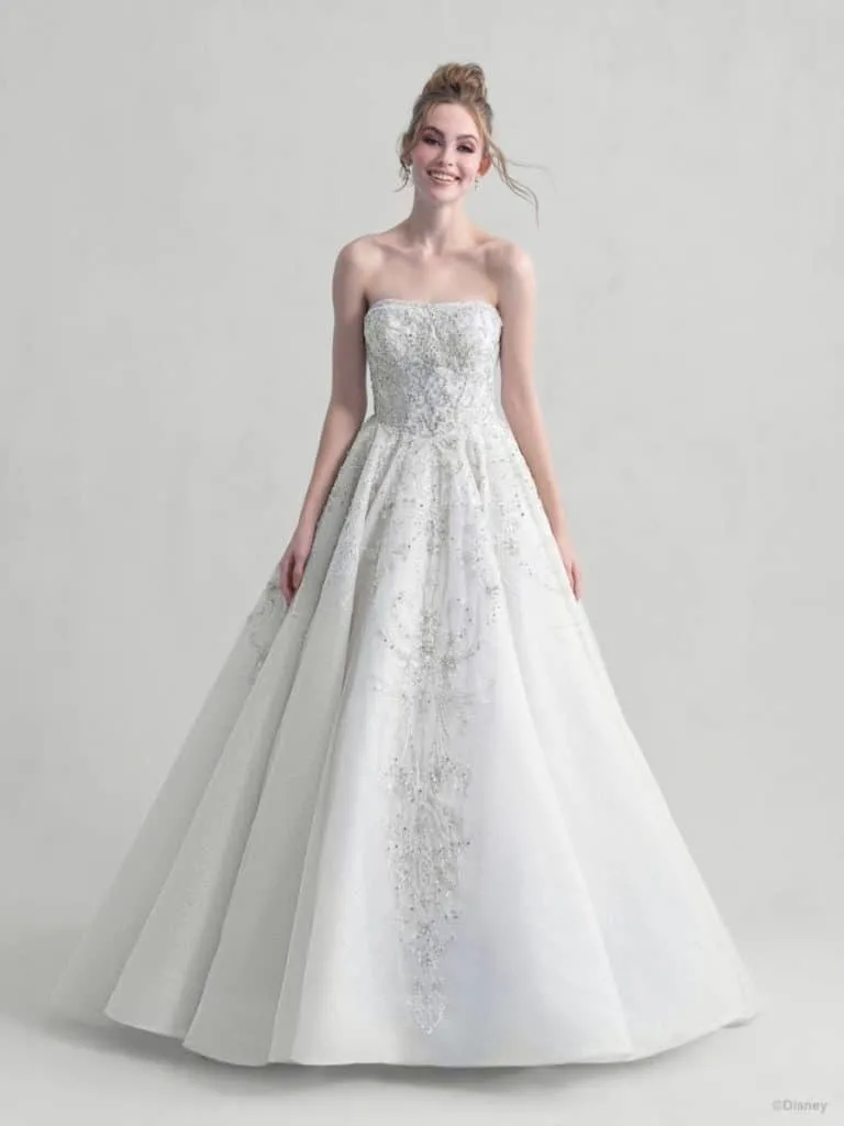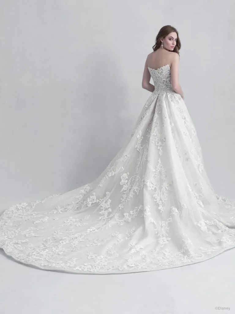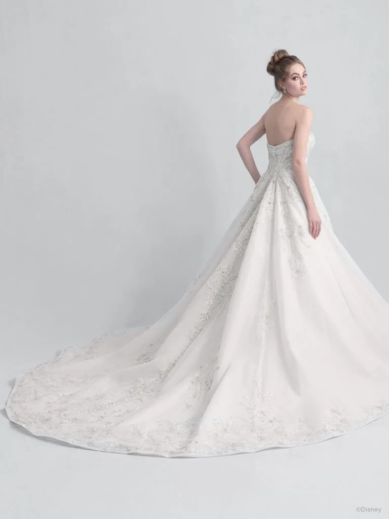 This classic ballgown Disney wedding dress is full of magical floral ‘briar rose’ inspired detail. The strapless gown has a very distinctive neckline.
