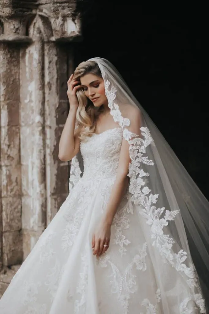 You can see just how dramatic this beautiful Cinderella Wedding Dress looks from the back, when it is paired with a cathedral length veil.