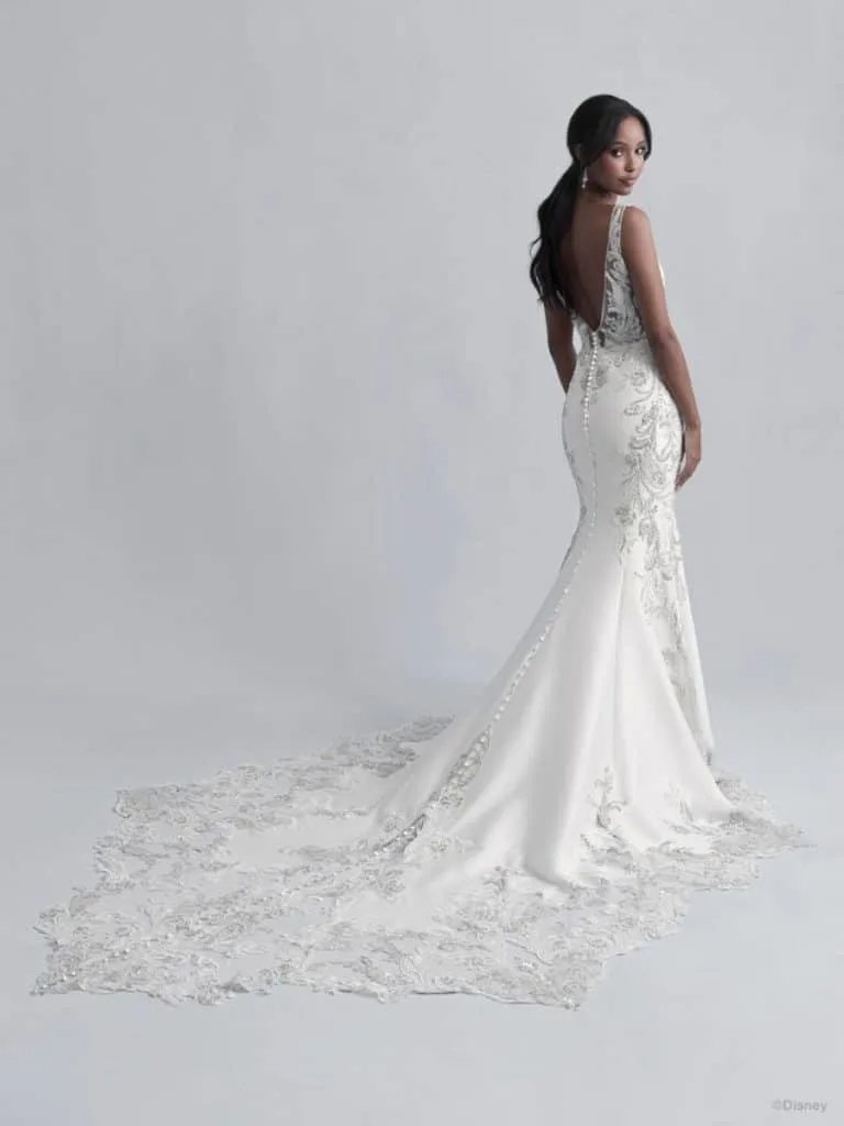 This Ariel dress has button detailing at the back and has a chapel length train. Perfect for a wedding at Disney’s Castaway Cay.