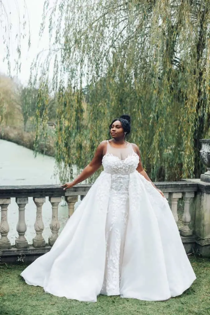 There is an optional organza overskirt which is full detachable. I am not sure how much this adds to the dress – although you could certainly have this for the ceremony and then not for the reception or vice versa.