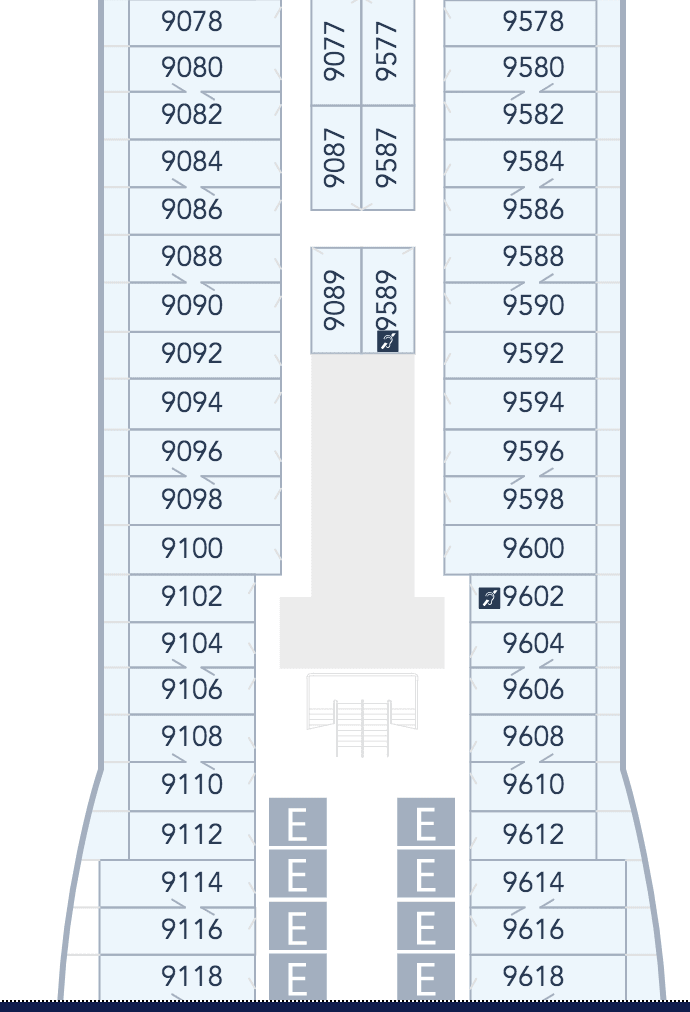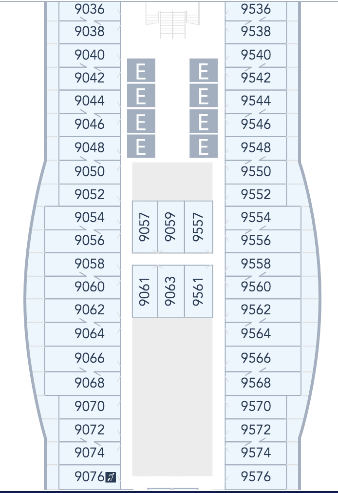The most popular of the Inside Staterooms on Deck 9 is likely to be 9057, 9059, 9557, 9061, 9063 and 9065. This is because they are midships and many people prefer those.