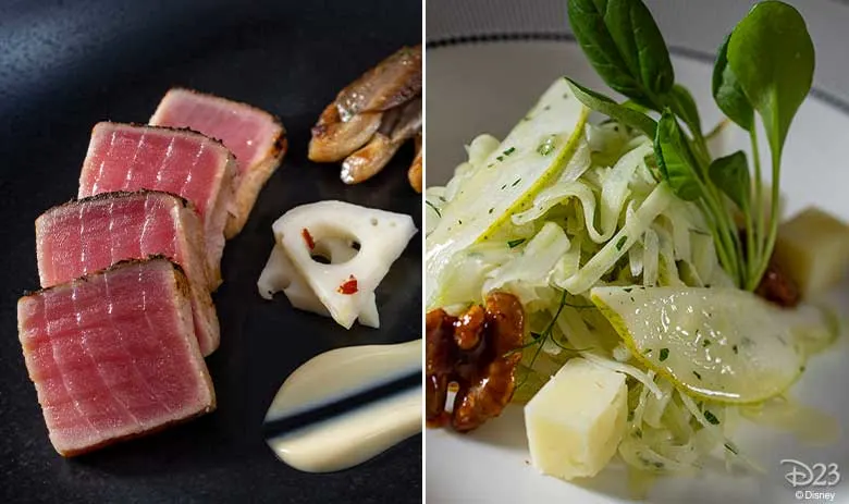 Two menu items have been revealed so far including a savory porcini-spiced ahi tuna appetizer and fennel, Bartlett pear, and Tatsoi salad accented with Manchego cheese, walnuts, and a sherry dressing.