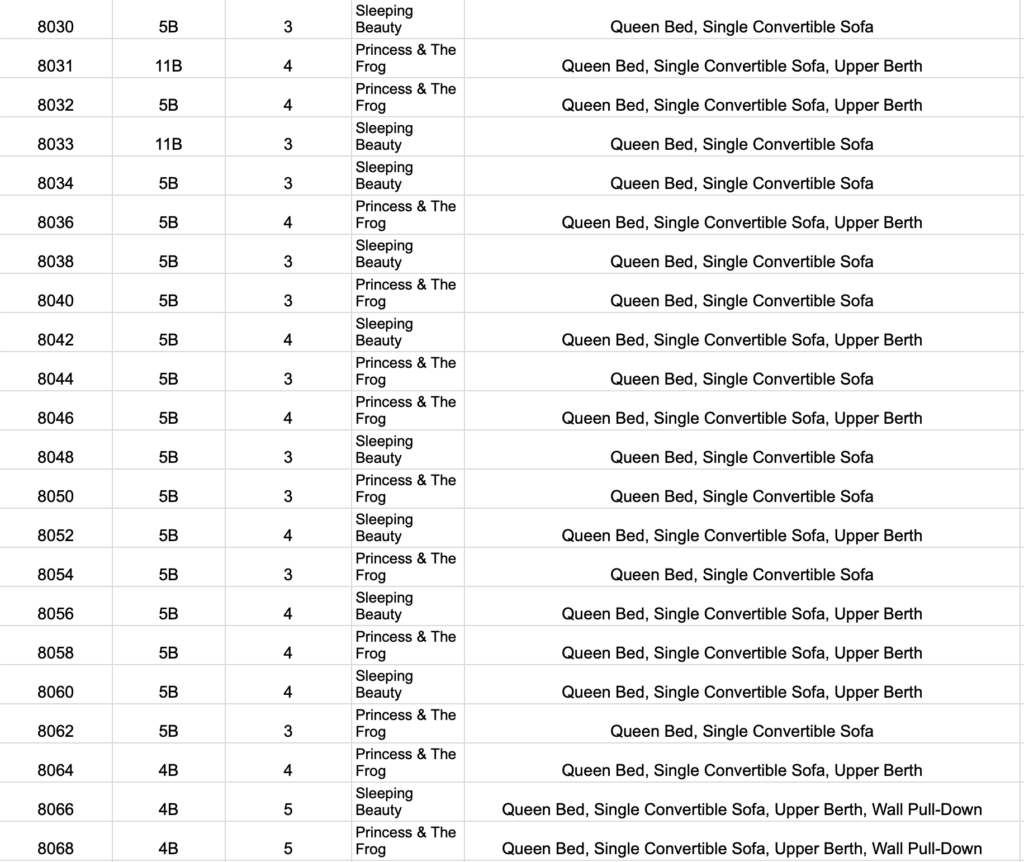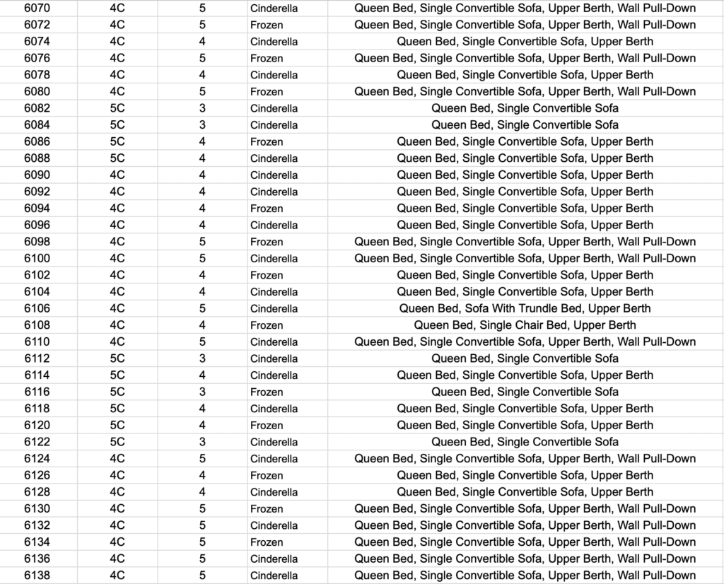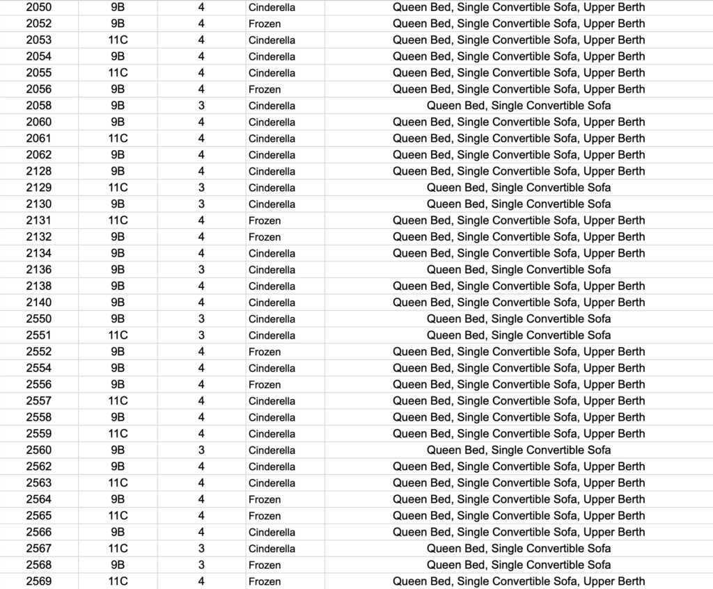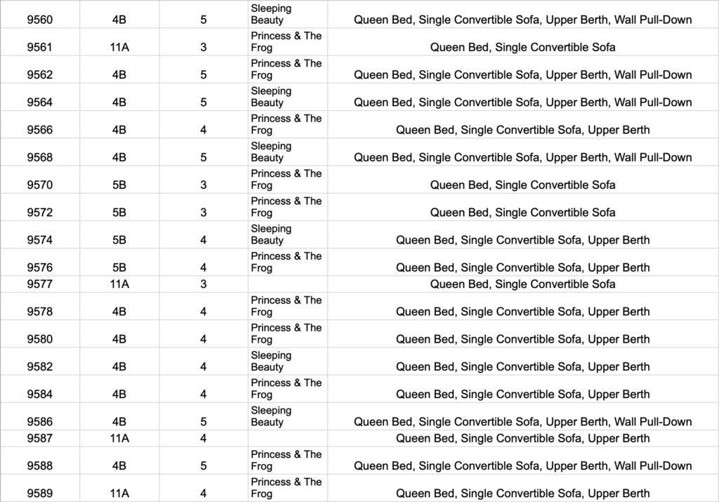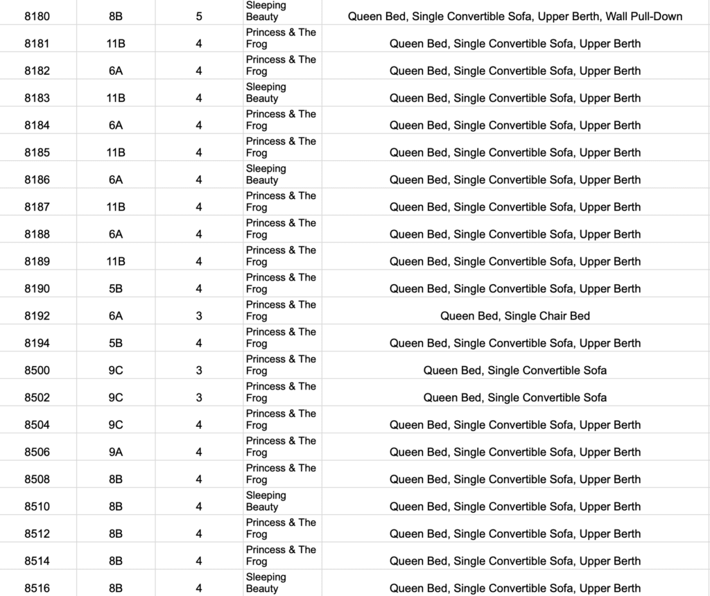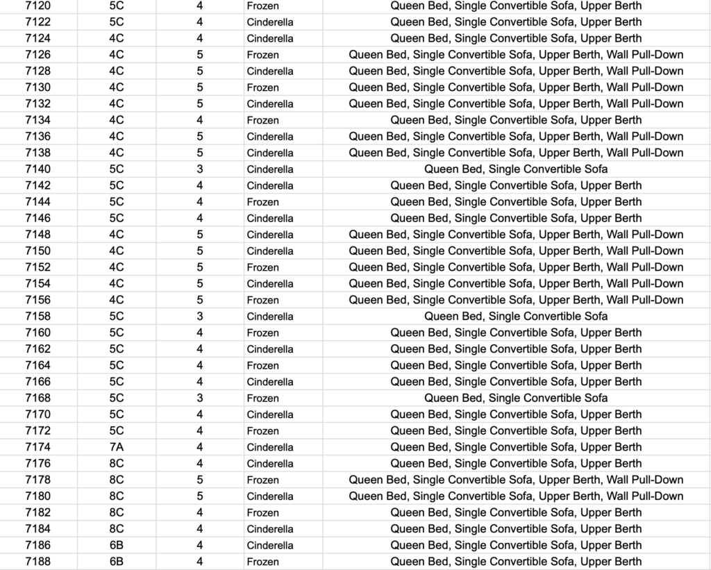 When you look at the lists below you will see a number and a letter identifying the type of stateroom.