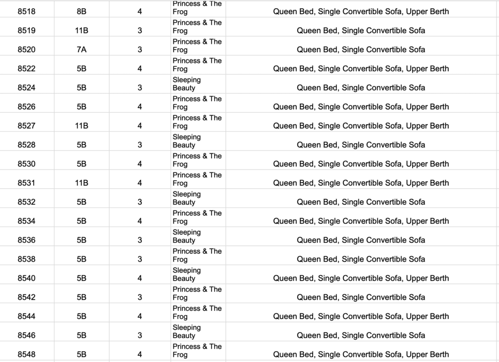 The stateroom themes for non concierge staterooms are Cinderella, Frozen, Princess and the Frog and Sleeping Beauty.