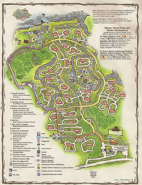 Fort Wilderness is a large resort at over 700 acres. There are 3 resort buses – Orange, Purple and Yellow which run around the resort and between the Outpost Depot at the front of the resort near the Disney bus transportation, and the Settlement Depot which is near the marina which has boat access to Magic Kingdom.