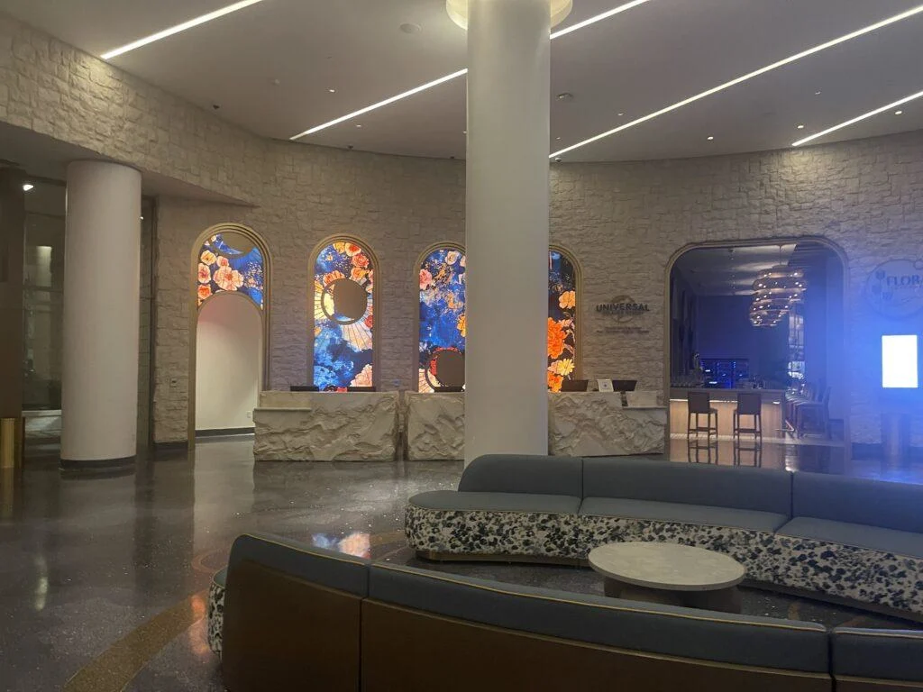 However, there is a stunning view out of the huge windows, and from the overlook patio to Celestial Park in Epic Universe. These views do go a long way to making up for the distinctly average lobby area.