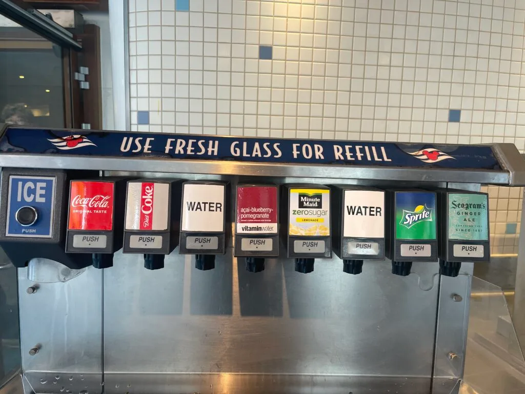 Pro Tip: Always grab your soda, coffee, or juice from the beverage stations rather than ordering from a bar or lounge, where you’ll be charged extra.