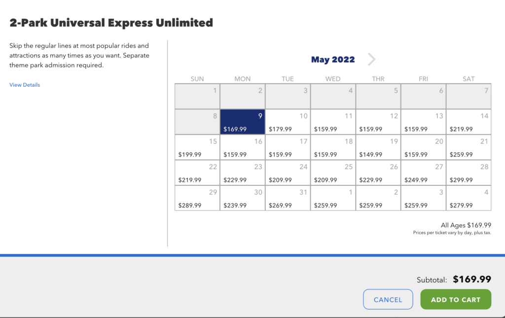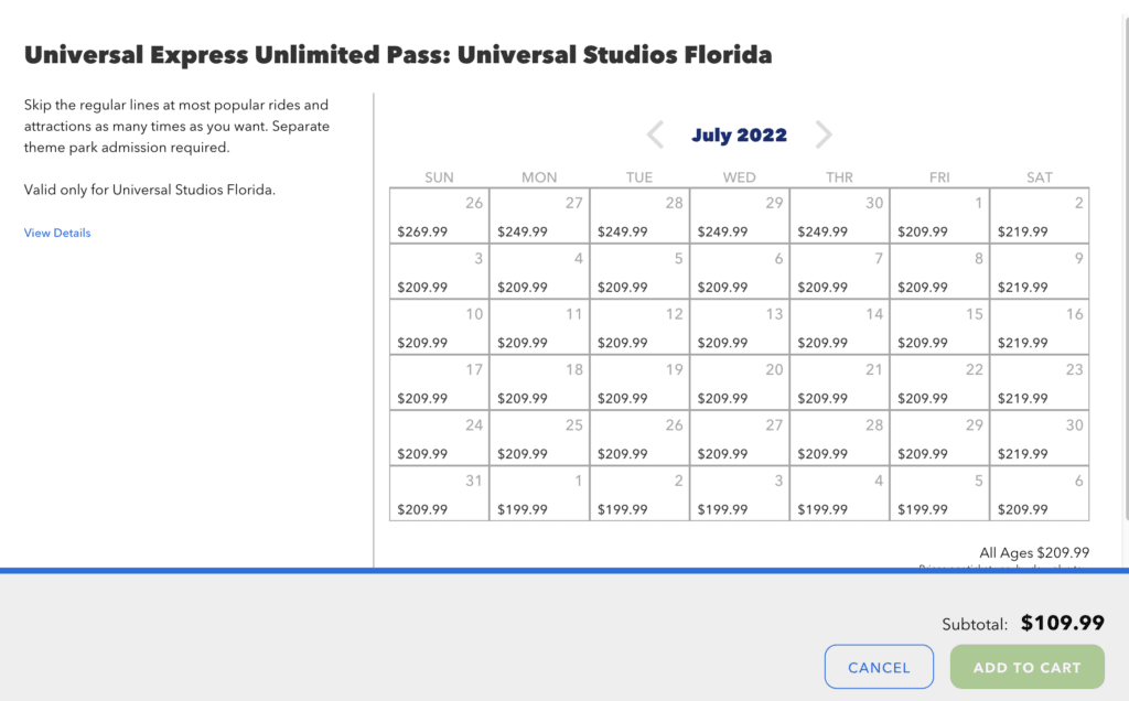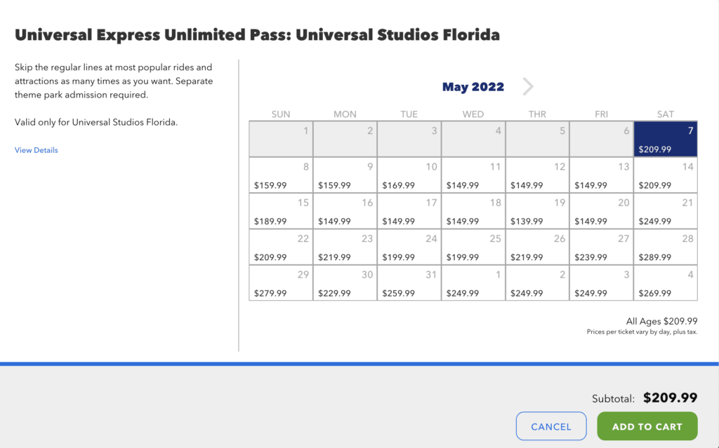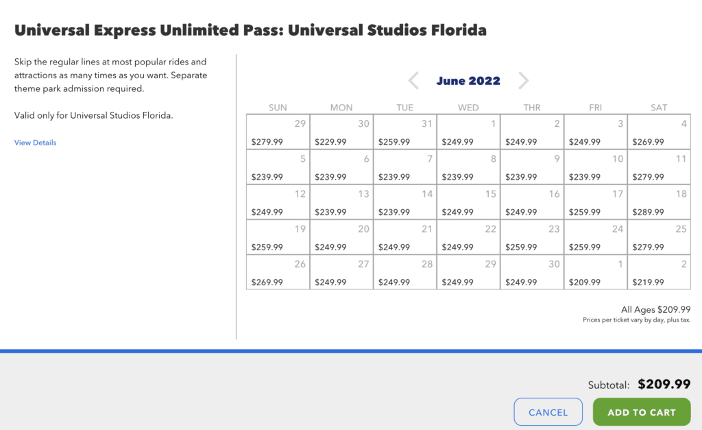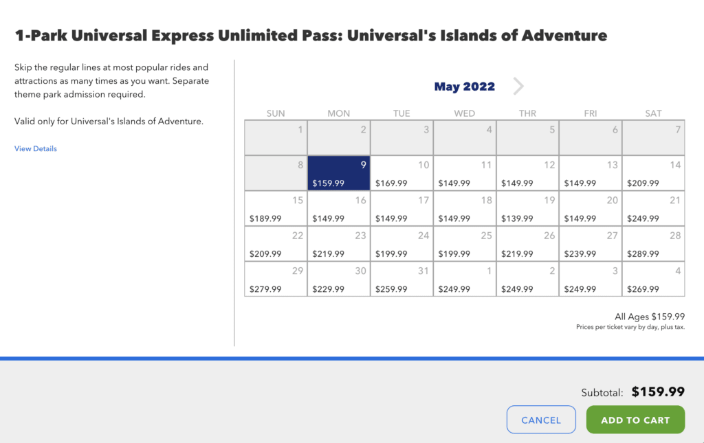 The price of all the Express Passes depends upon crowd projections. The busier the day is predicted to be, the higher the price.