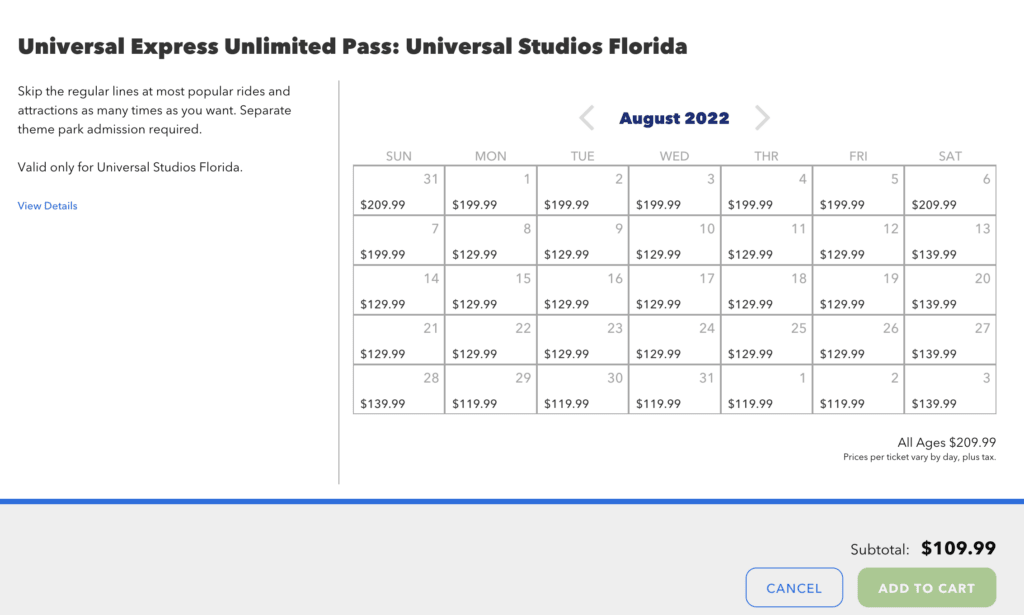 The Universal Express Unlimited Pass varies in price according to the day that you want to use it. Prices start from $109.99 per person per day.