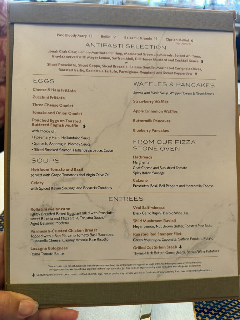 Palo is Disney Cruise Line’s adult only Italian restaurant, and brunch is available on most sea days during your cruise.
