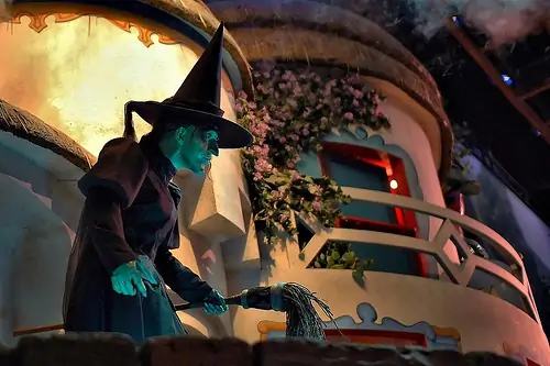 The ride then goes through a scene from Fantasia projected onto the walls before arriving in Munchkinland for The Wizard of Oz. This is a large and very colorful area with lots of singing animatronic figures. The Wicked Witch of the West makes a scary appearance before we ride out past all the classic Wizard of Oz characters and into a dark theater to watch a montage of movie clips. These movie clips have been updated relatively recently and everyone will find one of their favorite movies.