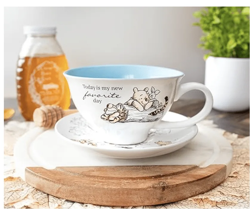 Be excited for your next tea party thanks to this teacup and saucer set that features ornate artwork of Winnie-the-Pooh, Tigger, Eeyore, Piglet, and Rabbit in the Hundred Acre Woods, with text that reads “Today is my new favorite day”
